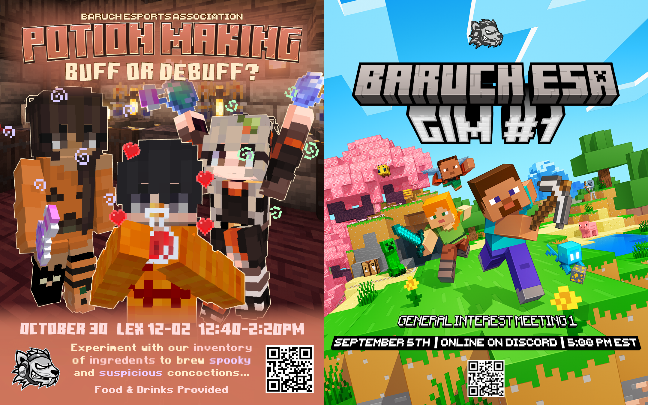 Posters following a vibrant and comfortable style to attract gamers to Baruch Esports Association events.